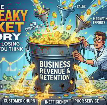 Imagine your business as a bucket filled with water. The water represents your customers, revenue, or leads. You keep pouring more water into the bucket through marketing, advertising, and promotions. But there’s a problem—your bucket has leaks.